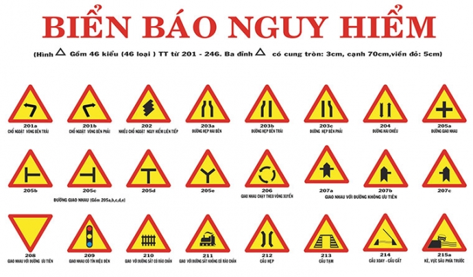 Biển báo nguy hiểm cho người tham gia giao thông biết trước các nguy hiểm trên đường để chủ động phòng ngừa kịp thời. Biển chủ yếu có hình tam giác đều, viền đỏ, nền màu vàng, trên có hình vẽ màu đen mô tả sự việc cần báo hiệu.